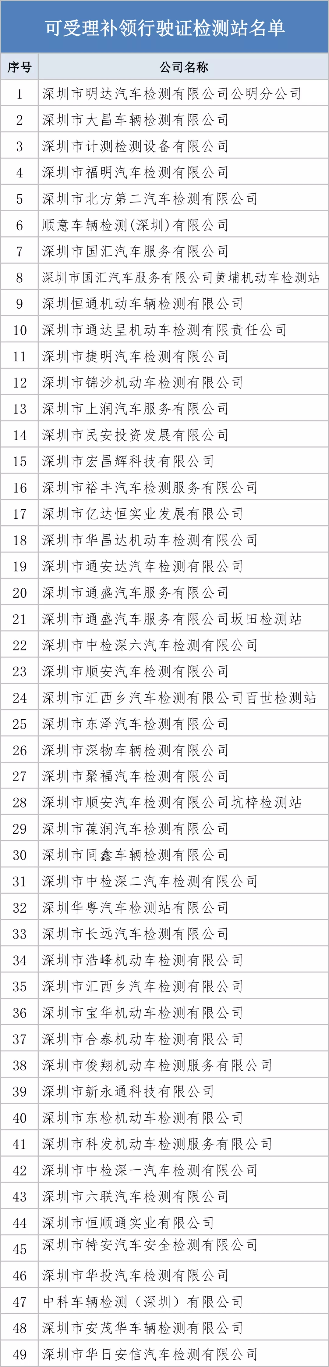 僅限深圳機(jī)動(dòng)車(chē),在下列49家檢測(cè)站辦理年檢業(yè)務(wù)才可以在檢測(cè)站申請(qǐng)補(bǔ)換領(lǐng)行駛證!