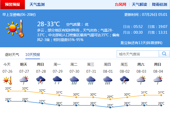 記者從市氣象臺(tái)獲悉,受副熱帶高壓影響,26日多云,局部有短時(shí)陣雨,氣溫28~33 ℃,局部最高35 ℃;27日多云,部分地區(qū)有短時(shí)陣雨或雷雨,天氣炎熱;28日有雷陣雨,伴有短時(shí)強(qiáng)降水和6~8級(jí)短時(shí)大風(fēng);29日有雷陣雨,局部大雨;30~31日有一次明顯降雨過(guò)程。