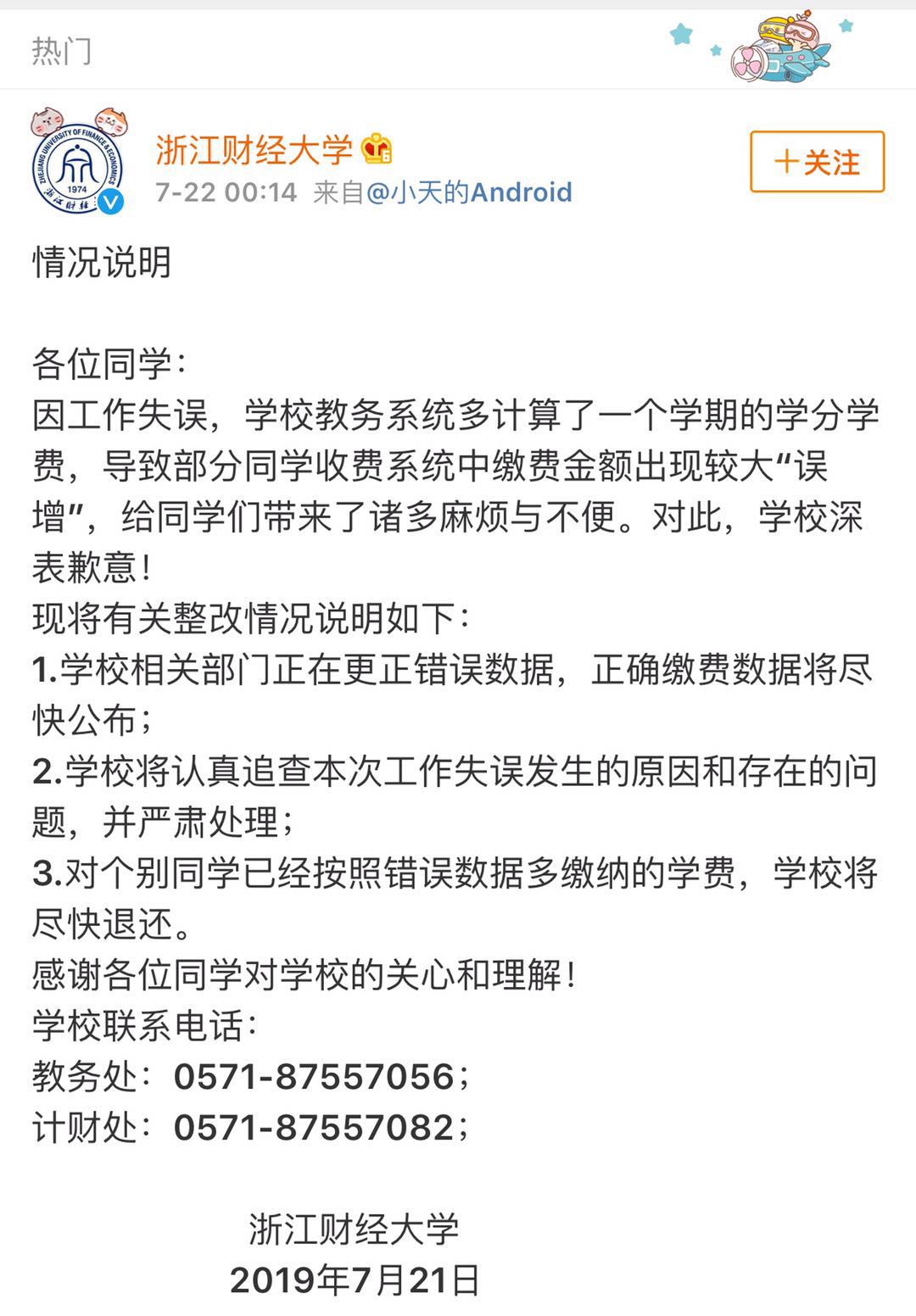 22日,浙江財(cái)經(jīng)大學(xué)就此事作出回應(yīng):算錯(cuò)學(xué)費(fèi)