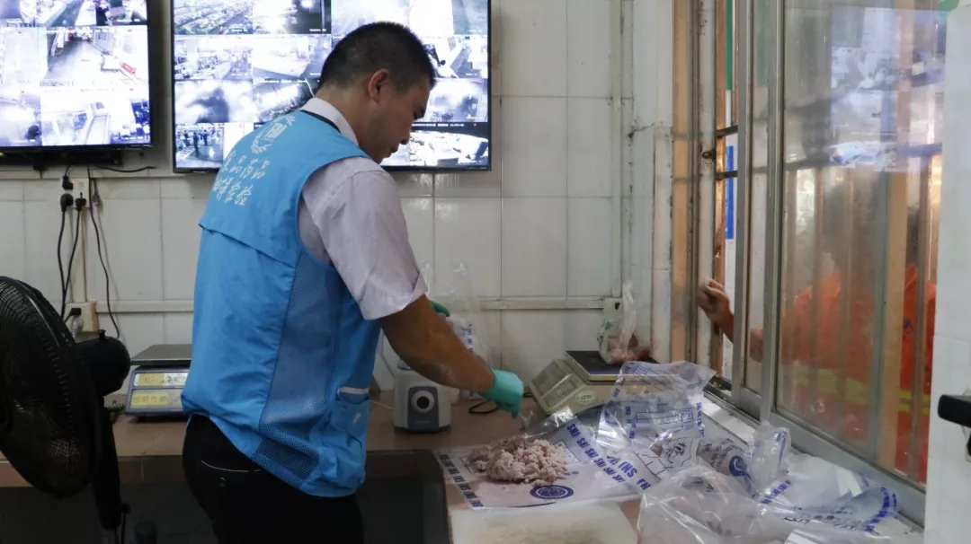 執(zhí)法人員根據(jù)市場(chǎng)開辦方提供的市場(chǎng)檔位明細(xì)表,首先隨機(jī)選取了市場(chǎng)內(nèi)的肉檔、水產(chǎn)品檔、菜檔,逐一進(jìn)行檢查,對(duì)檔位的營(yíng)業(yè)執(zhí)照、臺(tái)賬建立情況檢查無(wú)誤后,執(zhí)法人員又隨機(jī)指定了檢查品種,由快檢人員現(xiàn)場(chǎng)開展快檢工作。