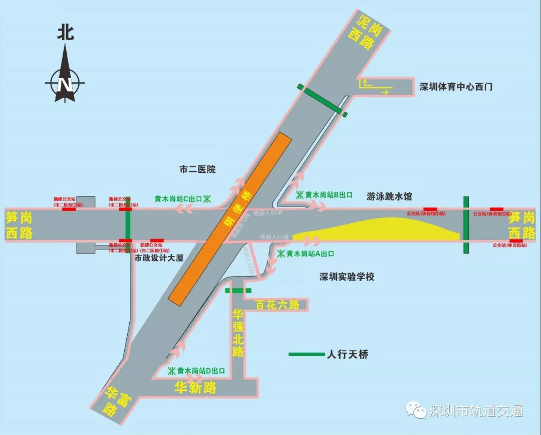 在本次調(diào)整中,華富路-泥崗西路南北向交通只能通過鋼便橋雙向六車道行車。泥崗西路、華富路、筍崗西路左轉(zhuǎn),行人線路及“市二醫(yī)院”,“體育館”公交站臺均有所調(diào)整。