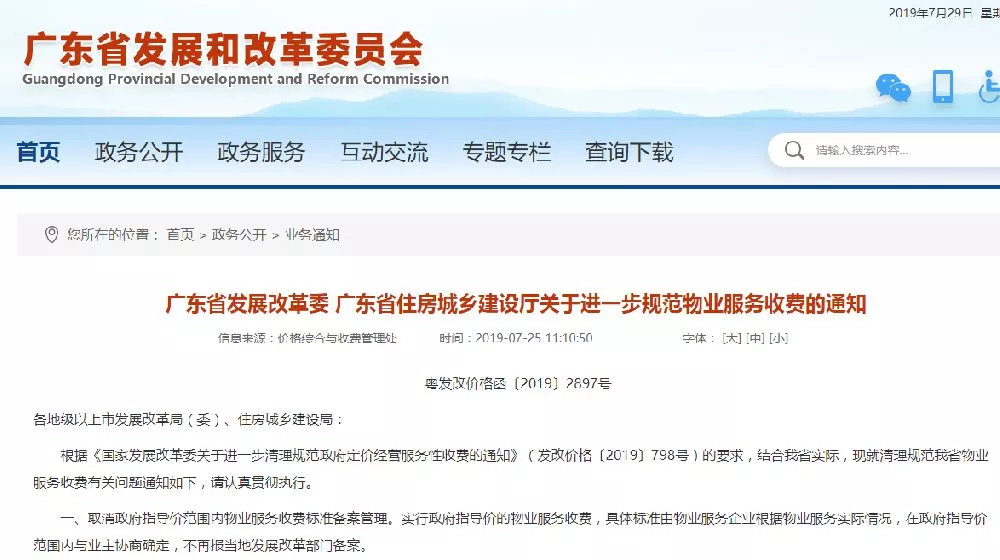 廣東省物業(yè)服務(wù)收費(fèi)規(guī)范新規(guī)定自2019年8月1日起執(zhí)行。實(shí)行政府指導(dǎo)價的物業(yè)服務(wù)收費(fèi),具體標(biāo)準(zhǔn)由物業(yè)服務(wù)企業(yè)根據(jù)物業(yè)服務(wù)實(shí)際情況,在政府指導(dǎo)價范圍內(nèi)與業(yè)主協(xié)商確定,不再報當(dāng)?shù)匕l(fā)展改革部門備案。