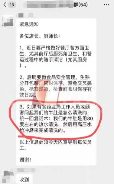 這張聊天截圖顯示:前晚7點54分,八合里的一個內部群,發(fā)出了一則緊急通知,要求店長、廚師長近期要做好餐廳各方面衛(wèi)生,后廚要做好食品安全管理。如果有食藥監(jiān)局工作人員或顧客詢問,牛肚是怎么清洗的,統(tǒng)一回復的話術是:我們的牛肚是用80度左右的熱水清洗,然后用高壓水槍沖磨來完成清洗的。