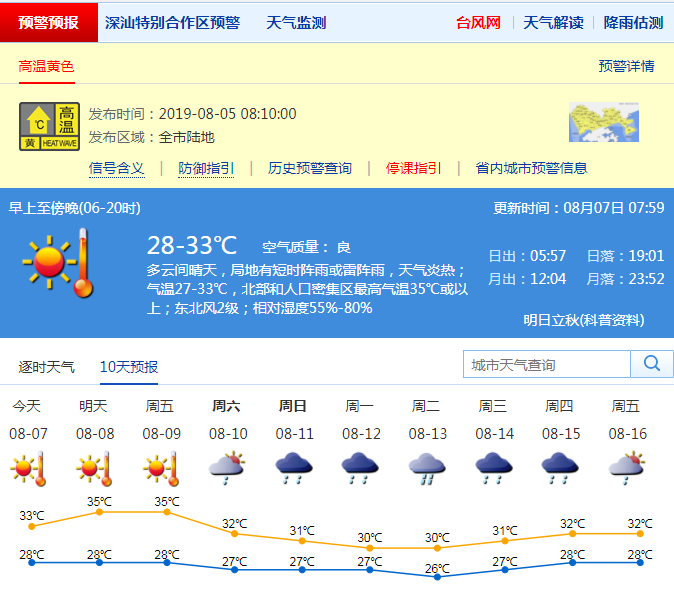 見圳客戶端·深圳新聞網(wǎng)2019年8月7日訊 深圳今日氣溫28-33℃,多云間晴天,局地有短時陣雨或雷陣雨,天氣炎熱。預計8-9日天氣持續(xù)炎熱,大部分地區(qū)最高氣溫33-35℃,中北部和人口密集區(qū)36℃或以上,午后有局地熱雷雨;10-12日有陣雨或雷陣雨,局部大雨。今年第9號臺風“利奇馬”(強熱帶風暴級)未來趨向臺灣以東洋面,預計對我市無直接風雨影響。