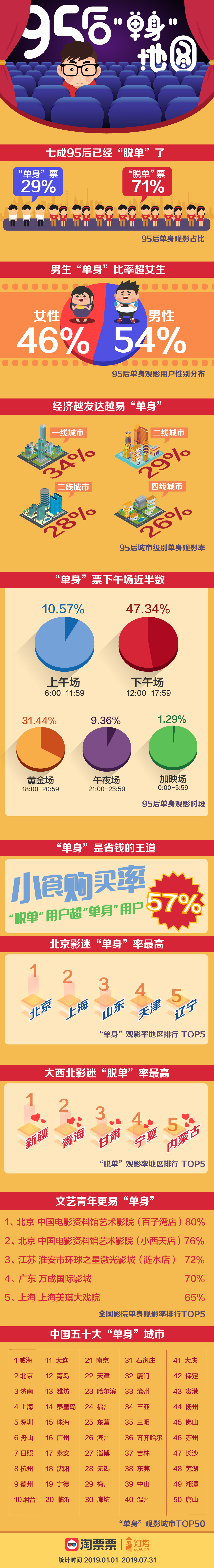 淘票票及燈塔專業(yè)版的數(shù)據(jù)顯示,在95后觀影人群中,有29%的用戶購(gòu)買“單身票”(僅買一張票)觀影,而71%的95后均選擇購(gòu)買兩張及以上電影票來(lái)觀影;在獨(dú)身觀影用戶中,男性以54%的占比超過(guò)女性8個(gè)百分點(diǎn);情感狀態(tài)也在一定程度上決定了用戶的觀影習(xí)慣。報(bào)告數(shù)據(jù)顯示,95后“單身”用戶集中在白天觀影,僅下午場(chǎng)(12:00-17:59)占比就達(dá)到47.34%,而晚9點(diǎn)后的夜場(chǎng)份額占比僅1成左右。