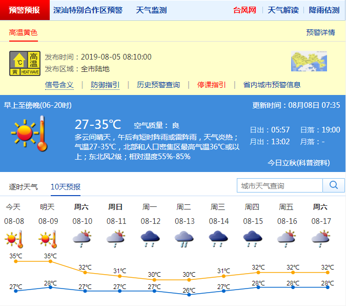 見(jiàn)圳客戶端·深圳新聞網(wǎng)2019年8月8日訊 隨著第9號(hào)臺(tái)風(fēng)“利奇馬”逐漸靠近,深圳逐漸受其外圍偏北下沉氣流影響,預(yù)計(jì)8-9日深圳市高溫加劇,晴天間多云,有輕微至輕度霾,氣溫28-35℃,北部和人口密集地區(qū)最高氣溫37℃以上,午后局地有熱雷雨,雨時(shí)伴有短時(shí)大風(fēng)。