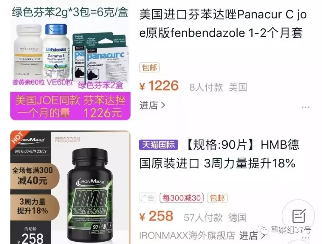 事情發(fā)展到現(xiàn)在,已經(jīng)有人在網(wǎng)上做起這門生意。在電商平臺(tái)搜索可見(jiàn),不少商家打出“喬伊套餐”等招牌售賣芬苯達(dá)唑,自稱是按美國(guó)患者喬的配方搭配,但如此一來(lái),原本20多元一瓶的藥,搭配后就要賣800元左右。