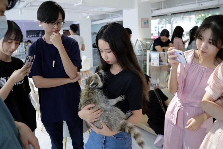 除了小動物和飼養(yǎng)員們,這里還聚集了許多年輕女孩兒,她們有的相互認識,輪流跟店里的小浣熊撓癢癢拍照;有的不認識彼此,卻因為飼養(yǎng)過同樣的小動物而熟絡(luò)起來,相互傳授養(yǎng)育自家"孩子"的經(jīng)驗。這只名為"六一"的小浣熊是這里的常駐小動物,面對市民們的熱情,"六一"毫不客氣地躺在小姐姐的臂彎里撒嬌,引來其他市民們爭相拍照。