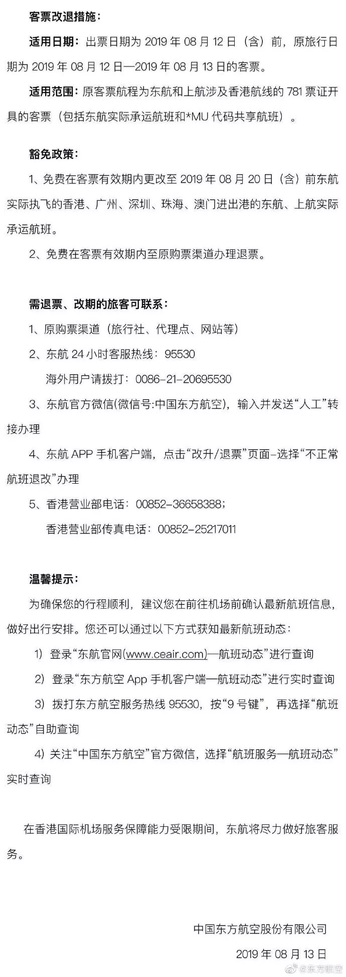 東航:取消13日期間