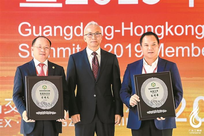 ▲2019年8月8日,中國(guó)國(guó)際貿(mào)易促進(jìn)委員會(huì)機(jī)械行業(yè)分會(huì)會(huì)長(zhǎng)孫喜田(中)向張耀華(右一)授予粵港澳先進(jìn)制造業(yè)產(chǎn)業(yè)聯(lián)盟主席牌匾。