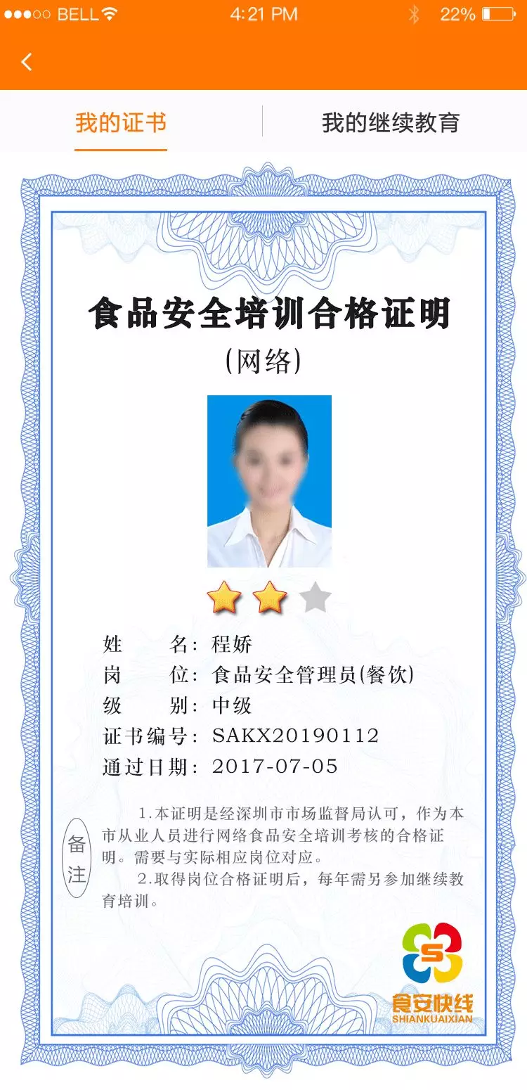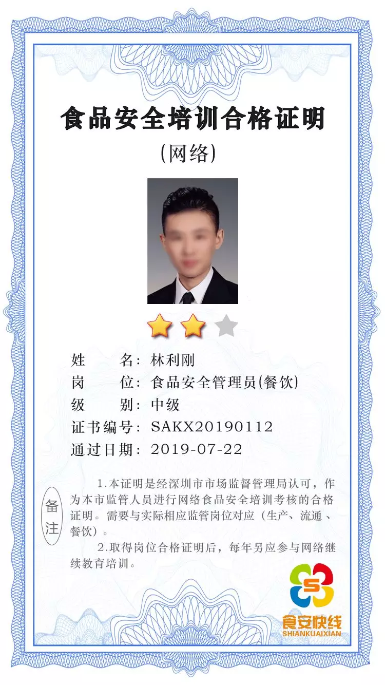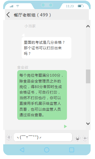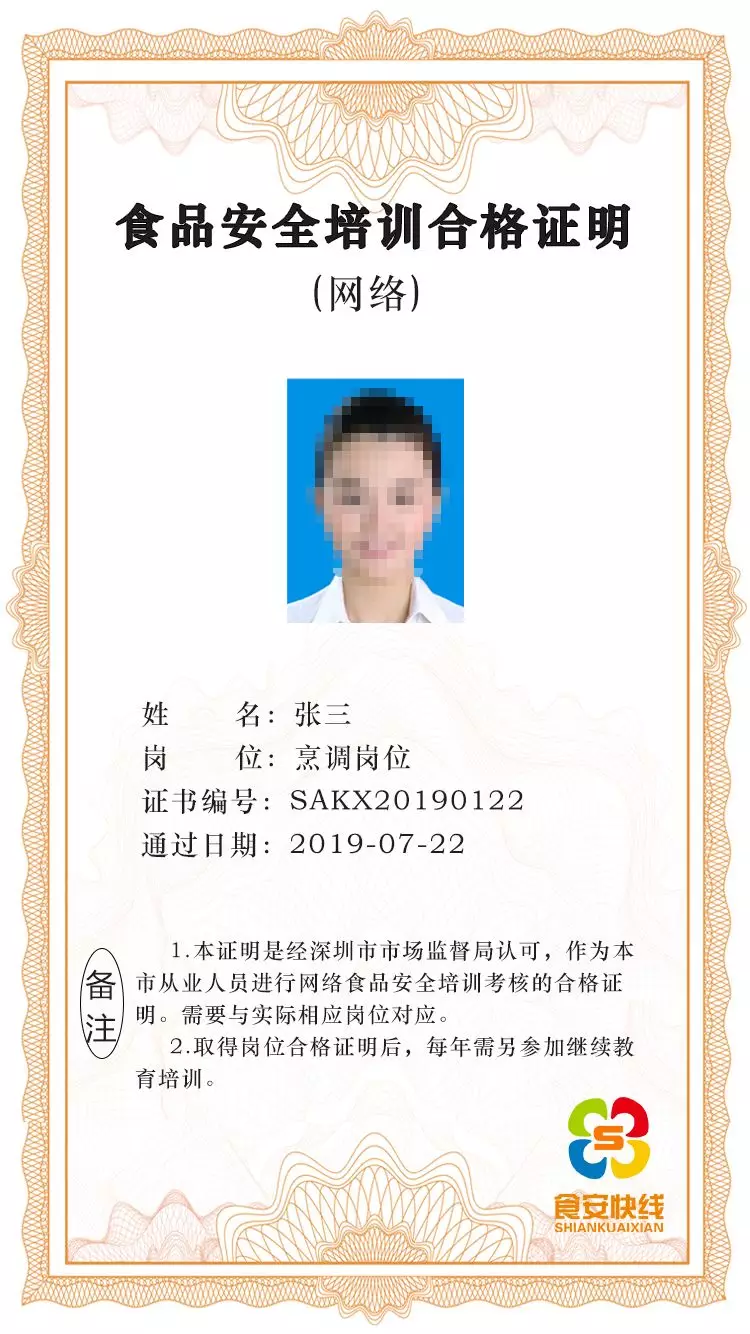 每個崗位考題滿分100分,可以重復(fù)考試,以最高分為最終結(jié)果,除食品安全管理員以外的崗位,得80分者即時生成電子合格證書,個人依據(jù)實際需要可以考取多項崗位合格證明。