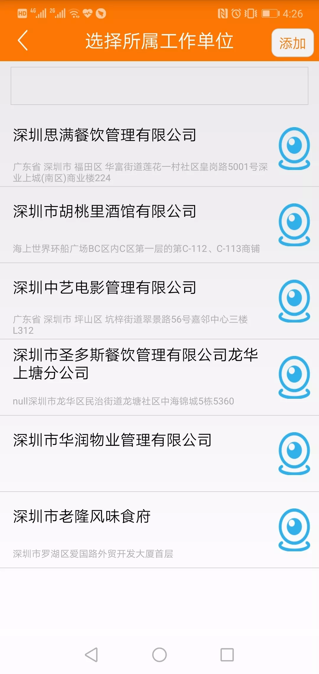 在選擇所屬單位時,可以通過搜索“名稱關(guān)鍵詞”快速查詢,如果沒有你的餐廳或單位名字,可以點(diǎn)右上角的【添加】來添加。