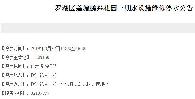停水客戶:鵬興花園一期、綜合樓、幼兒園、管理處