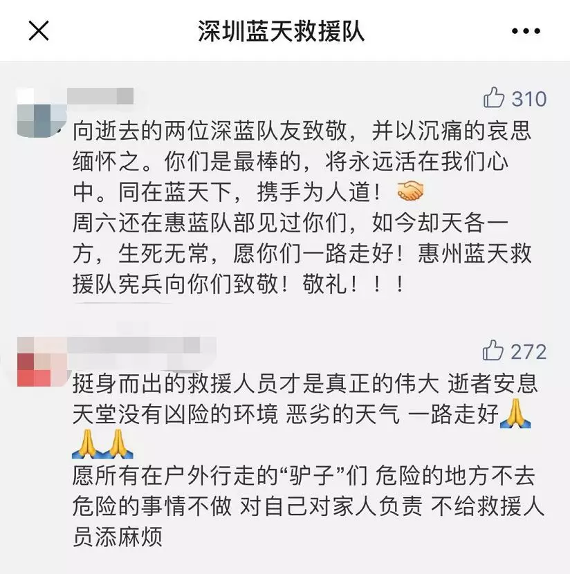 在深圳藍天救援隊微信留言中,有隊員悲痛惋惜隊友的離去,也有人質(zhì)疑驢友,明知惡劣天氣卻還要前往山野探險,這種行為是對自己對他人生命的不負責(zé)。