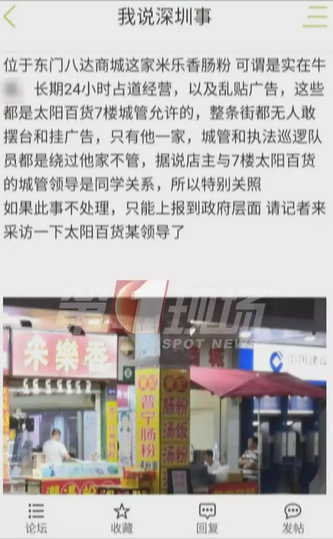昨天,論壇上的一則帖子引起網(wǎng)友圍觀,帖子提到位于東門八達商城的米樂腸粉店,24小時占道經(jīng)營,亂貼廣告。整條街都不敢這么做,唯獨這家沒有城管管理,原因是店主跟7樓太陽百貨的城管領(lǐng)導是同學。