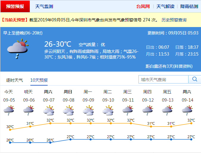 見圳客戶端、深圳新聞網(wǎng)2019年9月5日訊 今年14號臺風(fēng)“劍魚”(熱帶風(fēng)暴級)3日17時減弱為熱帶低壓后,其風(fēng)力進一步減弱,已難以確定其環(huán)流中心,中央氣象臺于4日2時停止對其編號。市氣象臺于4日8時30分取消臺風(fēng)白色預(yù)警信號。盡管如此,受“劍魚”減弱后低壓槽影響,今日我市有大雨局部暴雨,沿海、海區(qū)和高地陣風(fēng)6-7級;6日降雨減弱;7日起轉(zhuǎn)多云,有短時陣雨,天氣炎熱。