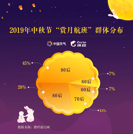 不僅如此,年齡結(jié)構(gòu)上,90后是空中追月人數(shù)最多的群體,占比為45%;其次是80后,占比達(dá)28%;70后和00后分列第三、第四位,占比分別為13%、7%。中秋當(dāng)晚(9月13日)、出發(fā)時(shí)間在18時(shí)至24時(shí)之間的航班通常被稱作“賞月航班”,機(jī)上乘客在飛行途中能近距離“接觸月亮”,感受“彩云追月”的新奇體驗(yàn)。