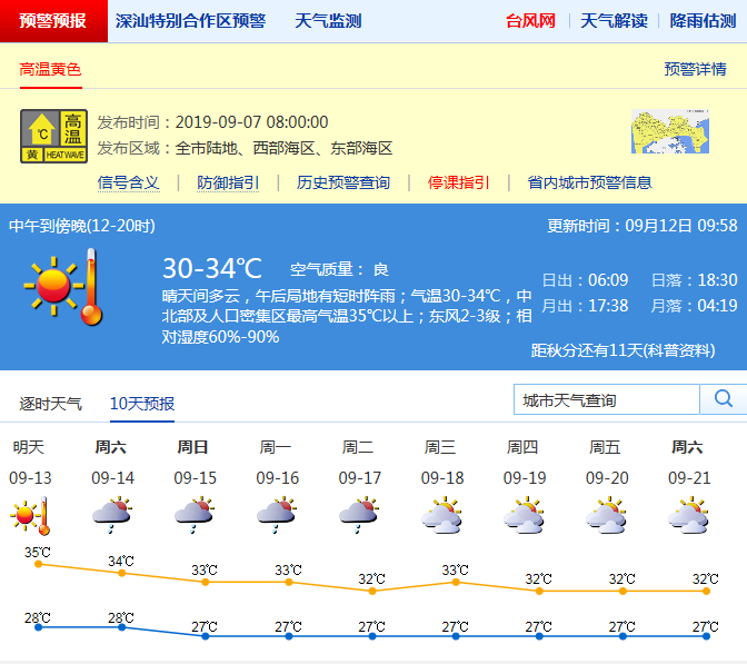 見圳客戶端·深圳新聞網(wǎng)2019年9月12日訊 深圳氣象局預計12日晴天間多云,天氣炎熱,局部有短時雷陣雨;氣溫28-34℃,中北部或人口密集區(qū)最高氣溫35℃以上;東風2-3級;相對濕度60%-90%。13日晴到多云,局部有短時雷雨;14-17日多云,有雷陣雨,高溫天氣逐漸緩解。