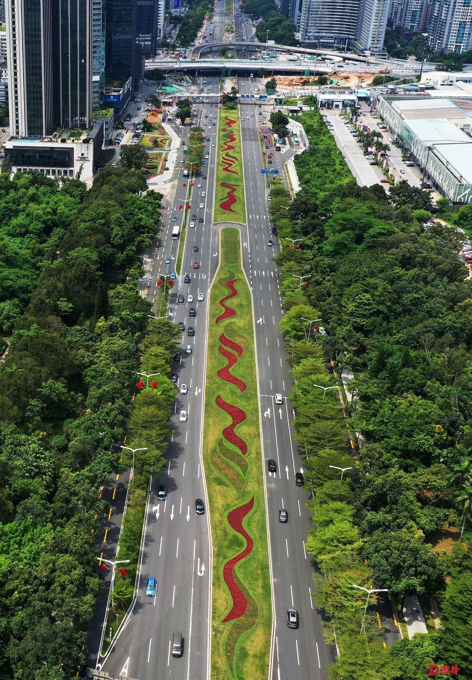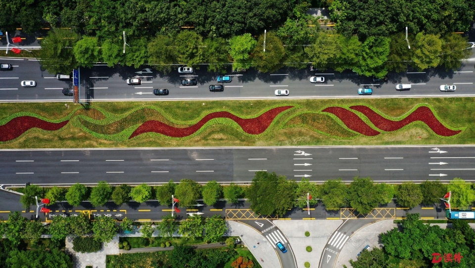 車輛行駛在深南大道上,沿路多處可以看到綠化工人們正在綠化帶上忙碌著,種植鮮花,修剪草坪,澆水養(yǎng)護(hù)。深南大道東段中間帶上,大紅色的赤壁,搭配藍(lán)色、粉色的大花香彩雀以及白里透粉的夏堇,共同組成了流線型的“鳳凰飛羽”圖案造型。從高處看去,綠化帶與兩側(cè)路燈上懸掛的鮮艷的國(guó)旗交相輝映,濃濃的節(jié)日氣息撲面而來(lái)。