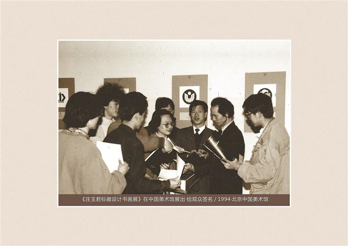 ▲1994年,《莊玉君標徽設計書畫展》在中國美術館展出,莊玉君在現(xiàn)場給觀眾簽名。