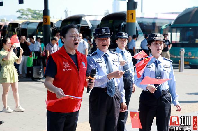 此時(shí),一首熟悉的《我和我的祖國》在人群中突然響起,引得周邊旅客紛紛駐足觀望。原來,深圳灣邊檢站民警為慶祝新中國成立70周年精心準(zhǔn)備的快閃節(jié)目此刻上演。隨后《我愛你中國》、《紅旗飄飄》依次唱響,現(xiàn)場的旅客逐漸圍攏過來,有和著旋律揮動(dòng)著國旗的,有拿起手機(jī)記錄下這激動(dòng)時(shí)刻的,現(xiàn)場變成一片紅色的海洋。其中一位年近七旬的李大爺激動(dòng)地說“聽到這旋律、看到五星紅旗心中就非常激動(dòng)。我是一名老兵,我為我們的祖國感到驕傲自豪”,說話間,老人眼中泛起了淚花。快閃表演結(jié)束后,大批旅客還不愿離去,大家紛紛舉起手機(jī),拿起國旗,拍下此刻最美的自拍,向祖國獻(xiàn)上最真摯的祝福:祝愿祖國明天更美好!