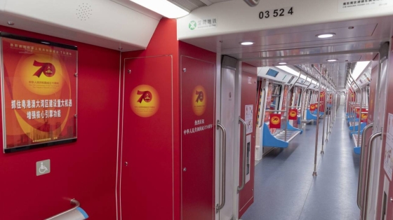 ②為熱烈慶祝中華人民共和國成立70周年,營造濃厚國慶氛圍,以深圳地鐵為載體的國慶主題列車于9月22日上線運營,將持續(xù)運行1個月,成為深圳一道美麗的城市風(fēng)景線。