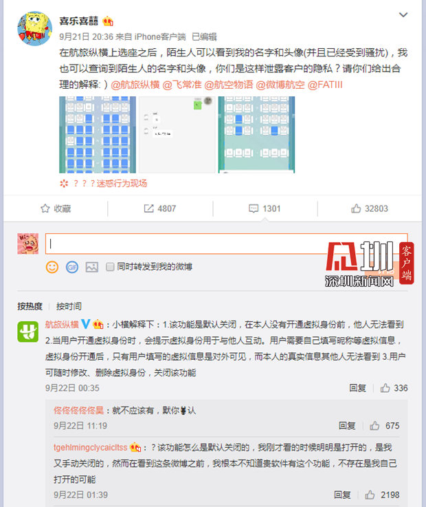 見圳客戶端.深圳新聞網(wǎng)2019年9月26日訊(見圳客戶端、深圳新聞網(wǎng)記者 張玲)“航旅縱橫”APP,最近因?yàn)橐粋€(gè)舉動(dòng)被用戶質(zhì)疑泄露個(gè)人隱私。9月21日,微博網(wǎng)友@喜樂喜囍發(fā)微博稱,這款A(yù)PP默認(rèn)開啟“允許他人與我進(jìn)行私聊”,在用戶選座后,陌生人可以查詢到自己的名字和頭像。該博主將陌生人騷擾的頁面截圖發(fā)上了微博,引發(fā)網(wǎng)友熱烈討論,在其個(gè)人話題下,有評(píng)論1301條,轉(zhuǎn)發(fā)4807次。