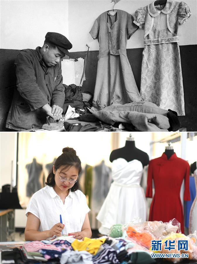拼版照片:上圖為1957年,天津市縫紉供銷社職工在用舊大褂改制當(dāng)時(shí)女性流行的服裝——“布拉吉”(俄語“連衣裙”的音譯)(新華社記者梁一丁攝);下圖為2019年6月20日,天津工業(yè)大學(xué)針織與針織服裝系教師匡麗赟在學(xué)校教室使用服裝企業(yè)廢棄的舊面料進(jìn)行創(chuàng)作(新華社記者岳月偉攝)。