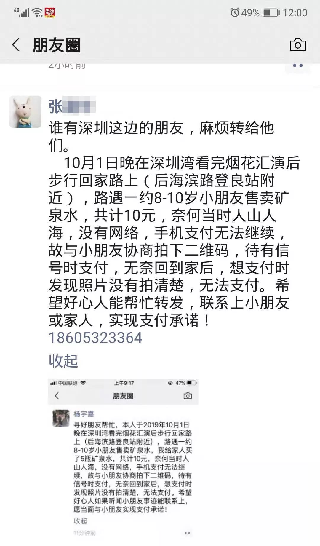 “10月1日晚,在深圳灣看完煙花表演后步行回家路上,路遇一約8-10歲小朋友售賣礦泉水,共計(jì)10元,奈何當(dāng)時(shí)人山人海,沒有網(wǎng)絡(luò)信號(hào),手機(jī)無法支付,故與小朋友協(xié)商拍下二維碼,待有信號(hào)時(shí)支付,無奈回到家后,想支付時(shí)發(fā)現(xiàn)照片沒有拍清楚,無法支付。希望好心人能幫忙轉(zhuǎn)發(fā),聯(lián)系上小朋友或家人,實(shí)現(xiàn)支付承諾!”