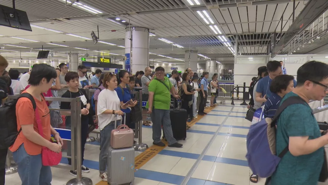 10月5日中午12點(diǎn),在皇崗口岸的入境大廳,有不少旅客提著大包小包的行李準(zhǔn)備排隊過關(guān)。整個入境大廳15條自助通道和13條人工通道已經(jīng)全部開啟,排隊過關(guān)的市民都可以在3分鐘之內(nèi)快速通關(guān)。