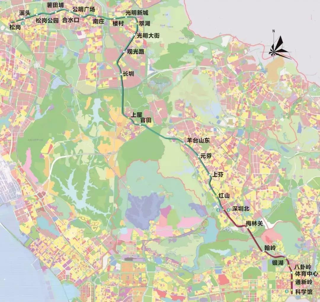 地鐵6號線分一、二期工程建設,其中,一期線路起自深圳北站,終于松崗站,并與地鐵11號線換乘,連接龍華、大浪、石巖、光明、公明、松崗等片區(qū),線路全長約37.6公里。共設車站20座,其中地下站5座、高架站15座、換乘站6座。