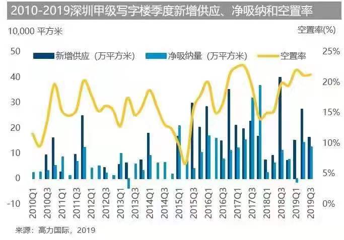 2019年第三季度,深圳甲級(jí)寫(xiě)字樓市場(chǎng)保持較為健康和活躍的態(tài)勢(shì),本季度內(nèi)市場(chǎng)凈吸納量表現(xiàn)良好,且新增供應(yīng)面積相比上一季度有所下降,空置率也穩(wěn)定在21.1%。但是,我們認(rèn)為空置率在第四季度會(huì)再次上升且持續(xù)到2020年,取決于計(jì)劃中的新增供應(yīng)完工入市情況。
