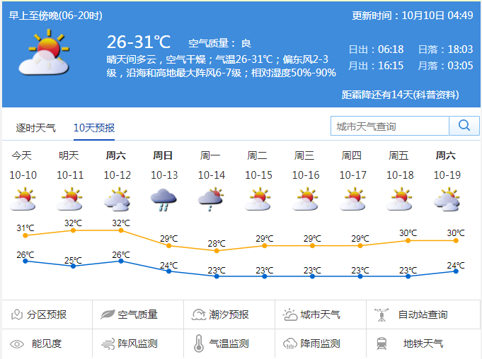 見圳客戶端·深圳新聞網(wǎng)2019年10月10日訊 據(jù)深圳市氣象局消息,今日深圳晴天間多云,空氣干燥;氣溫26-31℃;偏東風(fēng)2-3級,沿海和高地最大陣風(fēng)6-7級;相對濕度50%-90%。