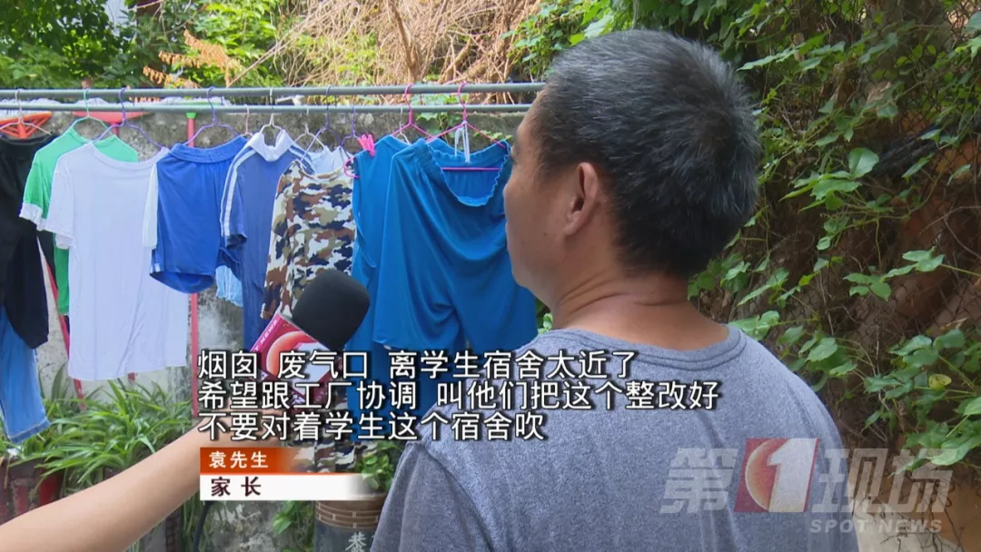 記者爬上學(xué)校附近一座高樓樓頂,清楚地看到工廠(chǎng)和寧遠(yuǎn)學(xué)校學(xué)生宿舍之間,僅僅是一墻之隔!家長(zhǎng)說(shuō),廢氣就是從工業(yè)園這棟樓的煙道排出的,正對(duì)著學(xué)生宿舍樓的方向。