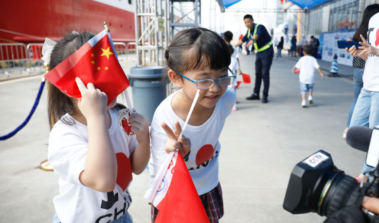 2019年10月14日,蛇口游輪母港CR2碼頭,兩位即將參觀“雪龍2”號科考破冰船的孩子們對起鏡頭比起手勢。