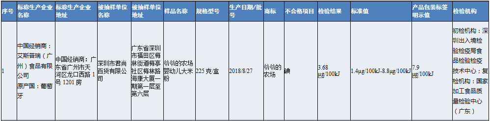 深圳市君尚百貨有限公司銷售的爺爺?shù)霓r場嬰幼兒大米粉(原產(chǎn)國:葡萄牙),其中碘檢出值低于產(chǎn)品包裝標簽明示值的80%,營養(yǎng)指標不達標。