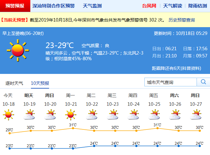 見圳客戶端·深圳新聞網(wǎng)2019年10月18日訊 深圳市氣象局消息,18日深圳晴天間多云,空氣干燥,早晚稍涼,氣溫23-29℃。19-22日深圳天氣持續(xù)晴好干燥,周末可以放心出門玩耍;23-24日多云,空氣干燥,早晚有輕霧。