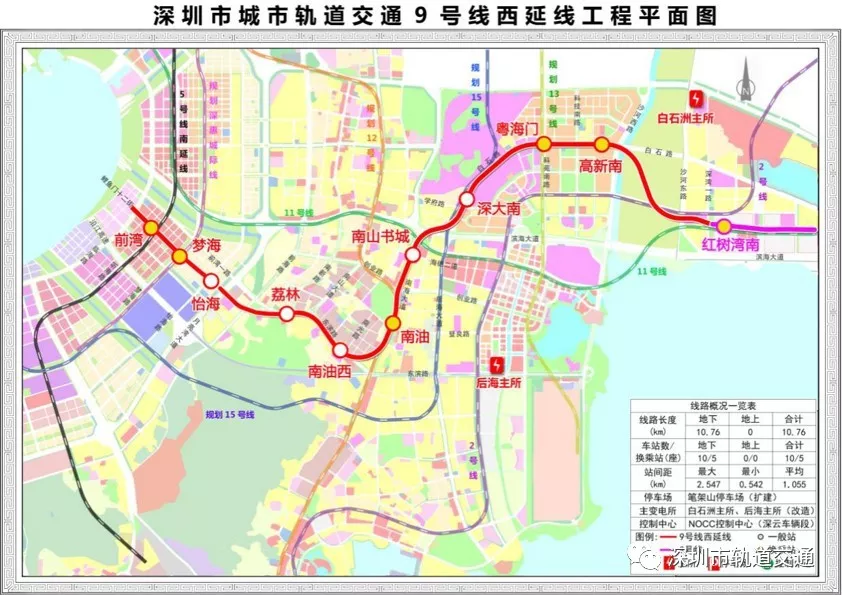 地鐵9號線西延線深入南山中心區(qū)和前海自貿(mào)區(qū),西起前灣站(與5號線南延線換乘),東至紅樹灣南站,全長約10.8公里,共設10座車站,其中5座換乘站。