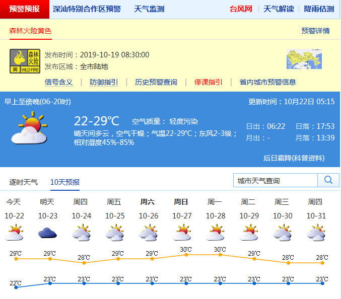 見圳客戶端·深圳新聞網(wǎng)2019年10月22日訊(見圳客戶端、深圳新聞網(wǎng)記者 施冰冰)最近深圳的天氣,早晚有點入秋的涼爽,可午后溫度依然不低。昨天白天,全市晴天間多云,早晨最低氣溫21-23℃,部分地區(qū)最高氣溫超過了33℃。天氣干燥,全市森林火險黃色預(yù)警信號生效中。