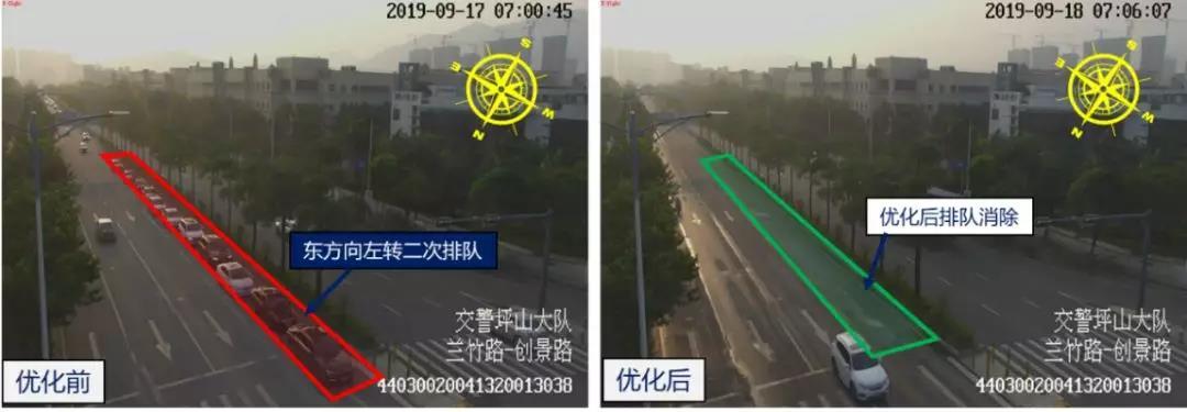 為解決該時(shí)段擁堵情況,交警優(yōu)化調(diào)整該路口早高峰時(shí)段紅綠燈,將早高峰時(shí)段由7時(shí)30分提前至6時(shí)50分,同時(shí)增加?xùn)|方向左轉(zhuǎn)綠燈時(shí)間20秒,以滿足車(chē)流通過(guò)需求。優(yōu)化后東方向左轉(zhuǎn)二次排隊(duì)情況消除,東方向左轉(zhuǎn)車(chē)通行量由原144pcu/h上升至196pcu/h,上升36.1%。