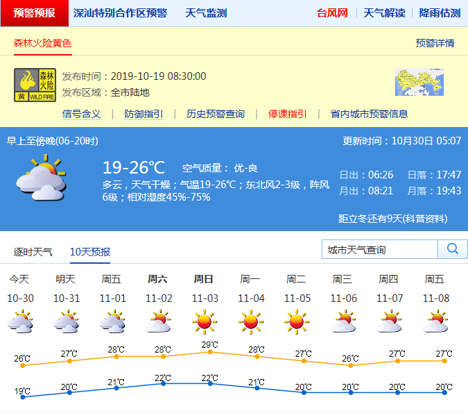 見圳客戶端·深圳新聞網(wǎng)2019年10月30日訊 深圳市氣象局預(yù)計30-31日多云間晴天,空氣干燥,氣溫19-26℃,早晚較涼;受冷空氣和熱帶低壓共同影響,30-31日沿海、高地和海區(qū)陣風(fēng)6-7級。11月1-5日晴天間多云,晝夜溫差加大,空氣持續(xù)干燥。