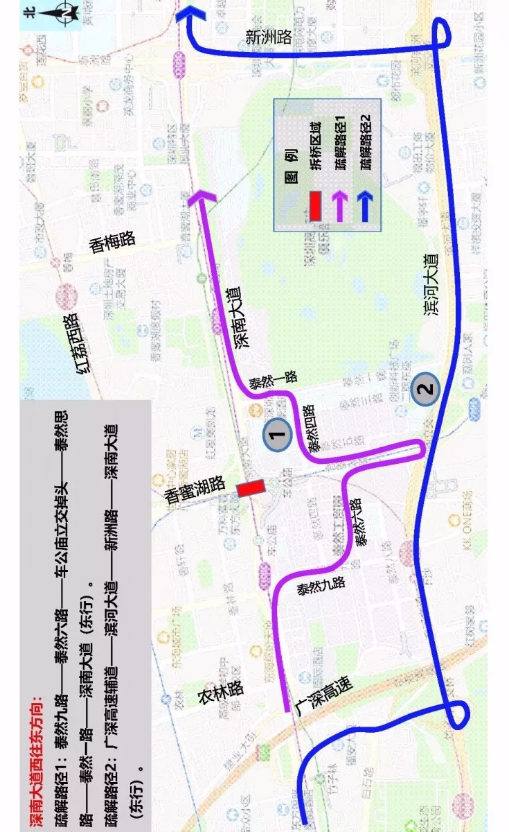 疏解路徑1:泰然九路→泰然六路→車(chē)公廟立交掉頭→泰然思路→泰然一路→深南大道(東行)