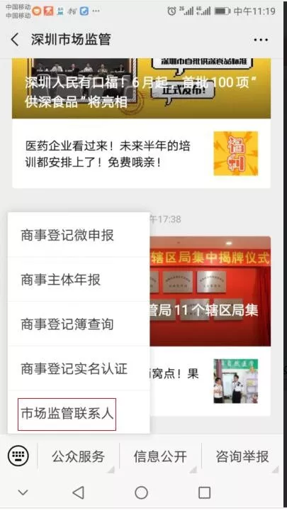 商事主體關(guān)注“深圳市場(chǎng)監(jiān)管”微信公眾號(hào),點(diǎn)擊“公眾服務(wù)-市場(chǎng)監(jiān)管聯(lián)系人”,可設(shè)置、修改市場(chǎng)監(jiān)管聯(lián)系人信息。