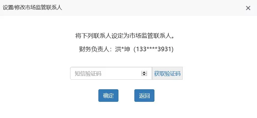 第四步:輸入收到的驗(yàn)證碼,點(diǎn)擊“確定”,完成市場(chǎng)監(jiān)管聯(lián)系人設(shè)置。