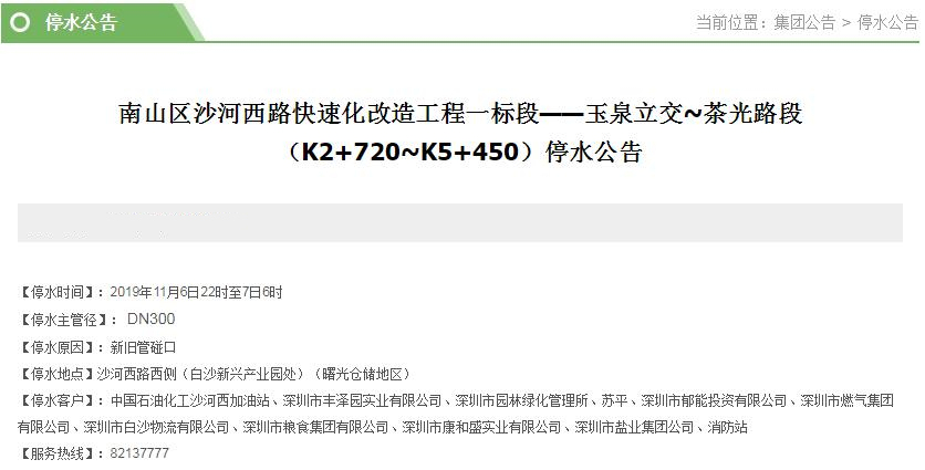 停水客戶:中國石油化工沙河西加油站、深圳市豐澤園實業(yè)有限公司、深圳市園林綠化管理所、蘇平、深圳市郁能投資有限公司、深圳市燃氣集團有限公司、深圳市白沙物流有限公司、深圳市糧食集團有限公司、深圳市康和盛實業(yè)有限公司、深圳市鹽業(yè)集團公司、消防站