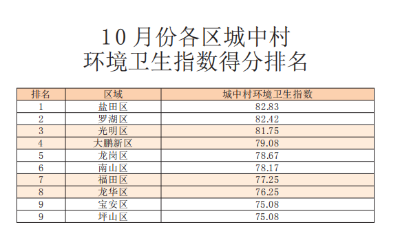 10月份各區(qū)城中村環(huán)境衛(wèi)生指數(shù)得分排名