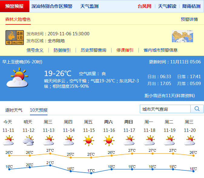 見圳客戶端·深圳新聞網(wǎng)2019年11月11日訊 最近鵬城天氣,終于有了一絲絲涼意,有點(diǎn)秋高氣爽的感覺了。剛剛過去的周末,全市晴天間多云,氣溫18℃-27℃。全市森林火險(xiǎn)橙色預(yù)警信號生效中。