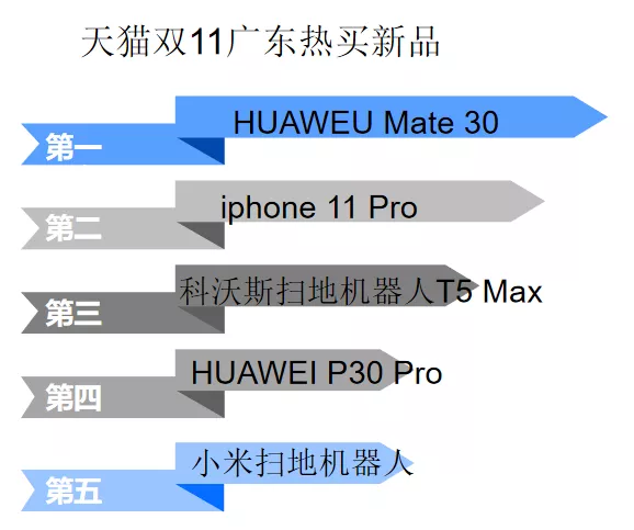 在熱賣的新品種,老廣對華為Mate 30熱情最高,其次是Iphone11 pro。值得一提的是,今年天貓雙11,蘋果官方旗艦店天貓僅用10分鐘,成交額超去年全天7倍。但是,顯然老廣對數(shù)碼產(chǎn)品有自己的看法。熱賣新品TOP5后三席分別是科沃斯掃地機(jī)器人T5 Max、華為 P30 Pro和小米掃地機(jī)器人,可見老廣對數(shù)碼科技產(chǎn)品比較鐘愛,持家的屬性讓家居類數(shù)碼產(chǎn)品獨(dú)受寵愛。