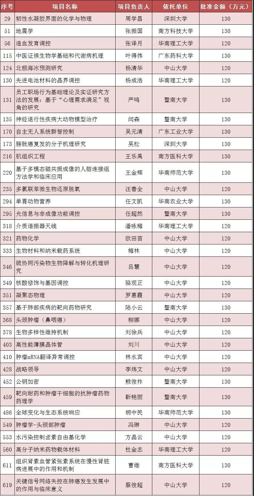 深圳大學(xué)2個(gè),分別是:韌性水凝膠界面的化學(xué)與物理(項(xiàng)目負(fù)責(zé)人:周學(xué)昌);膀胱癌復(fù)發(fā)的分子機(jī)理研究(項(xiàng)目負(fù)責(zé)人:吳松);
