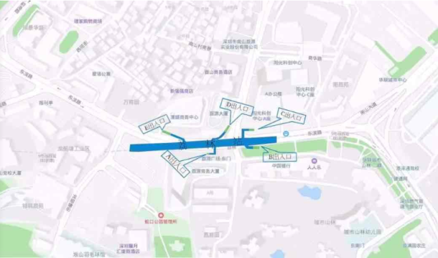 荔林站位于東濱路與南新路交叉口上,車站出入口共計(jì)5個(gè),A出入口位于荔園商務(wù)大廈北側(cè),B出入口位于城市山林廣場(chǎng)北側(cè),C出入口位于陽(yáng)光科創(chuàng)東南側(cè),D出入口位于荔源大廈東側(cè),E出入口位于濠盛商務(wù)中心南側(cè)